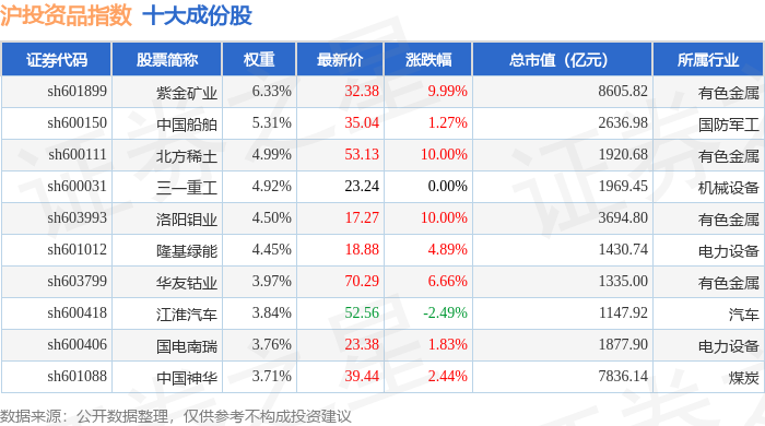 沪投资品(000102)指数十大成份股详情如下: