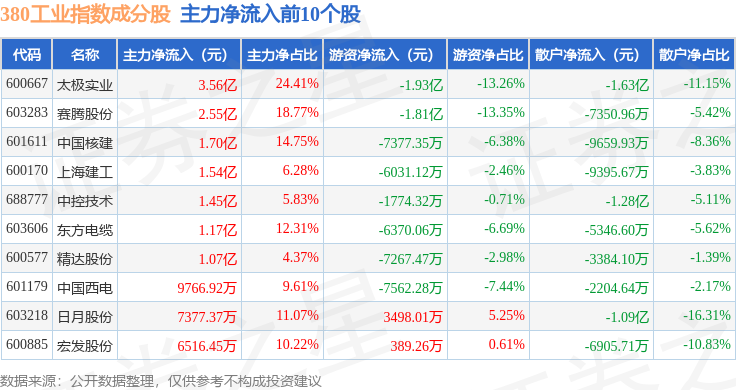 资金流向方面,380工业(000106)指数成份股当日主力资金净流入合计9851.39万元,游资资金净流出合计3.7亿元,散户资金净流入合计2.72亿元。成份股资金流向详情见下表: