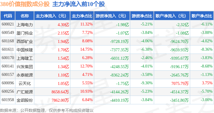 资金流向方面,380价值(000118)指数成份股当日主力资金净流入合计16.28亿元,游资资金净流出合计10.7亿元,散户资金净流出合计5.58亿元。成份股资金流向详情见下表: