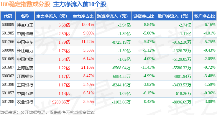 资金流向方面,180稳定(000125)指数成份股当日主力资金净流出合计45.29亿元,游资资金净流入合计18.28亿元,散户资金净流入合计27.01亿元。成份股资金流向详情见下表: