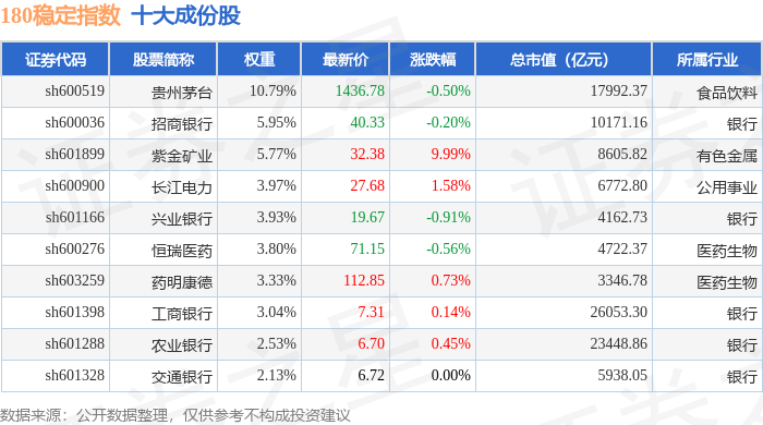 证券之星消息,10月9日,180稳定(000125)指数报收于11820.04点,涨1.22%,成交1380.87亿元,换手率0.49%。当日该指数成份股中,上涨的有62家,江西铜业以10.0%的涨幅领涨,下跌的有23家,招商轮船以6.19%的跌幅领跌。