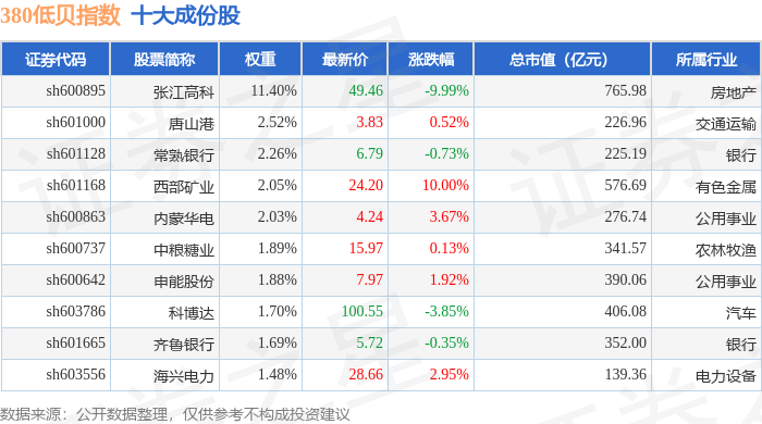 证券之星消息,10月9日,380低贝(000138)指数报收于8360.46点,跌0.34%,成交460.59亿元,换手率1.84%。当日该指数成份股中,上涨的有68家,和邦生物以10.1%的涨幅领涨,下跌的有31家,恒为科技以10.01%的跌幅领跌。