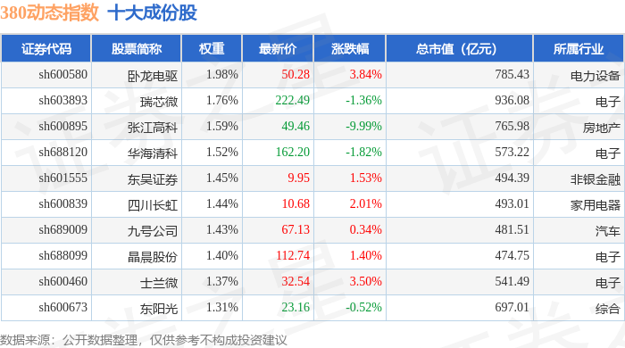 证券之星消息,10月9日,380动态(000141)指数报收于4112.38点,涨1.02%,成交1707.82亿元,换手率3.28%。当日该指数成份股中,上涨的有118家,中望软件以20.0%的涨幅领涨,下跌的有71家,海南华铁以10.02%的跌幅领跌。