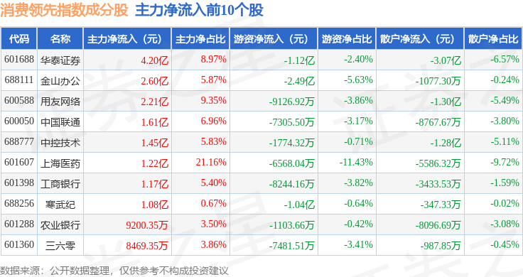 资金流向方面,消费领先(000148)指数成份股当日主力资金净流出合计69.61亿元,游资资金净流入合计34.63亿元,散户资金净流入合计34.98亿元。成份股资金流向详情见下表: