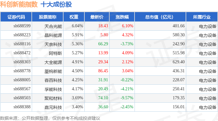 科创新能(000692)指数十大成份股详情如下: