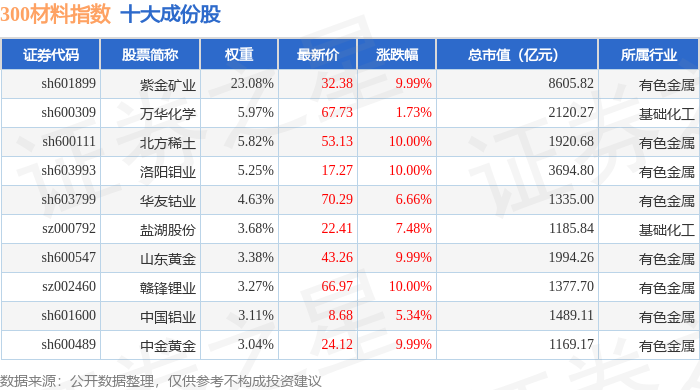 300材料(000909)指数十大成份股详情如下: