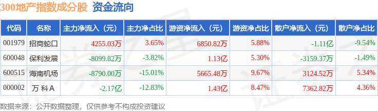 资金流向方面,300地产(000952)指数成份股当日主力资金净流出合计3.43亿元,游资资金净流入合计3.81亿元,散户资金净流出合计3777.88万元。成份股资金流向详情见下表: