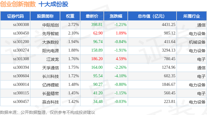 创业创新(399018)指数十大成份股详情如下: