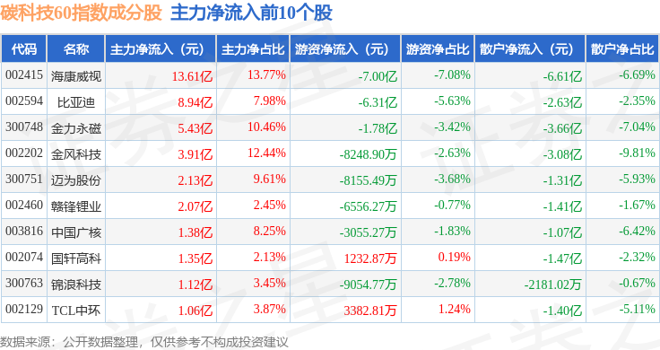资金流向方面,碳科技60(399060)指数成份股当日主力资金净流出合计21.58亿元,游资资金净流出合计252.65万元,散户资金净流入合计21.61亿元。成份股资金流向详情见下表: