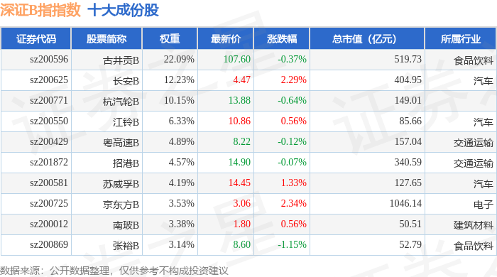 资金流向方面,深证B指(399108)指数成份股当日主力资金净流出合计893.57万元,游资资金净流出合计260.01万元,散户资金净流入合计1153.58万元。成份股资金流向详情见下表: