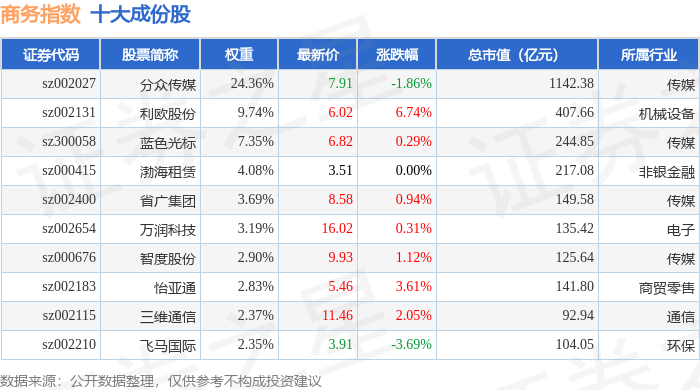 商务指数(399242)十大成份股详情如下: