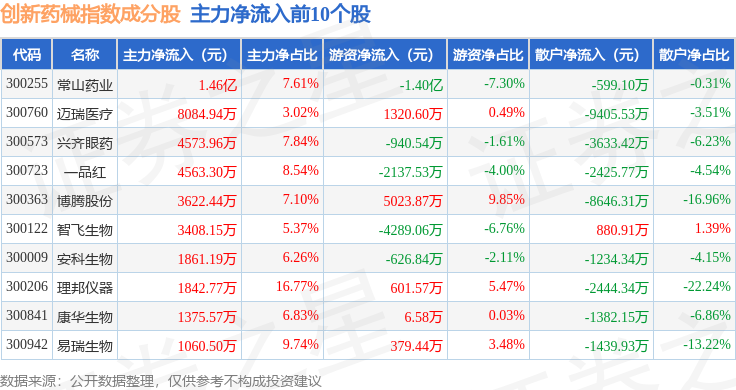 资金流向方面,创新药械(399265)指数成份股当日主力资金净流入合计1.07亿元,游资资金净流出合计1.33亿元,散户资金净流入合计2550.06万元。成份股资金流向详情见下表: