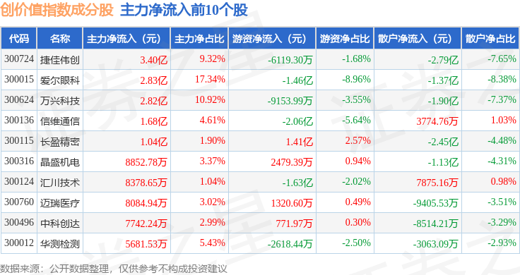 资金流向方面,创价值(399295)指数成份股当日主力资金净流出合计41.69亿元,游资资金净流入合计16.96亿元,散户资金净流入合计24.73亿元。成份股资金流向详情见下表: