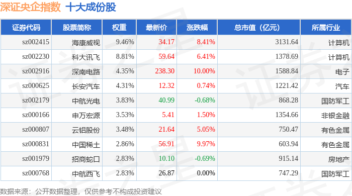 证券之星消息,10月9日,深证央企(399335)指数报收于4497.03点,涨3.7%,成交764.41亿元,换手率1.73%。当日该指数成份股中,上涨的有38家,云南铜业以10.01%的涨幅领涨,下跌的有11家,华侨城A以3.02%的跌幅领跌。