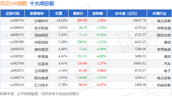 资金流向方面,民企100(399362)指数成份股当日主力资金净流出合计39.26亿元,游资资金净流入合计8.07亿元,散户资金净流入合计31.19亿元。成份股资金流向详情见下表: