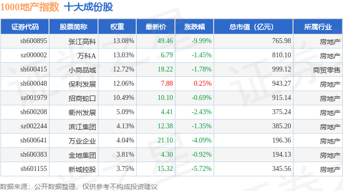 1000地产(399367)指数十大成份股详情如下: