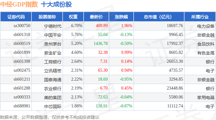 证券之星消息,10月9日,中经GDP(399399)指数报收于8396.16点,涨1.97%,成交4736.61亿元,换手率1.08%。当日该指数成份股中,上涨的有238家,铜陵有色以10.07%的涨幅领涨,下跌的有57家,万达电影以7.96%的跌幅领跌。