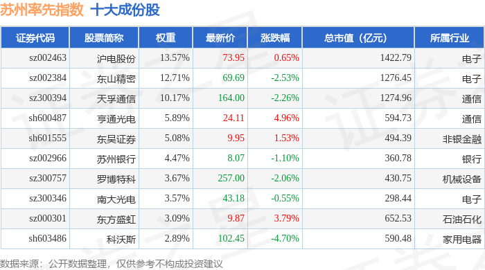 证券之星消息,10月9日,苏州率先(399410)指数报收于2747.37点,涨0.3%,成交426.34亿元,换手率2.93%。当日该指数成份股中,上涨的有15家,迈为股份以17.75%的涨幅领涨,下跌的有15家,泽璟制药以5.66%的跌幅领跌。