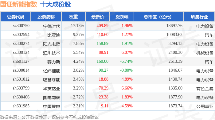 证券之星消息,10月9日,国证新能(399412)指数报收于3203.15点,涨2.5%,成交1897.85亿元,换手率2.7%。当日该指数成份股中,上涨的有42家,迈为股份以17.75%的涨幅领涨,下跌的有8家,赛力斯以6.74%的跌幅领跌。