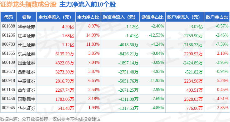 资金流向方面,证券龙头(399437)指数成份股当日主力资金净流出合计46.39亿元,游资资金净流入合计21.45亿元,散户资金净流入合计24.94亿元。成份股资金流向详情见下表: