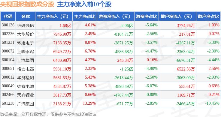 资金流向方面,央视回报(399553)指数成份股当日主力资金净流出合计21.95亿元,游资资金净流入合计9.1亿元,散户资金净流入合计12.85亿元。成份股资金流向详情见下表: