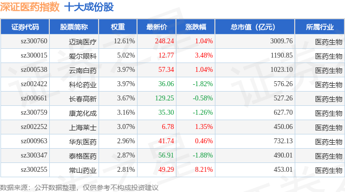 证券之星消息,10月9日,深证医药(399618)指数报收于8881.35点,涨0.53%,成交259.2亿元,换手率1.61%。当日该指数成份股中,上涨的有33家,常山药业以8.21%的涨幅领涨,下跌的有23家,奥赛康以4.34%的跌幅领跌。