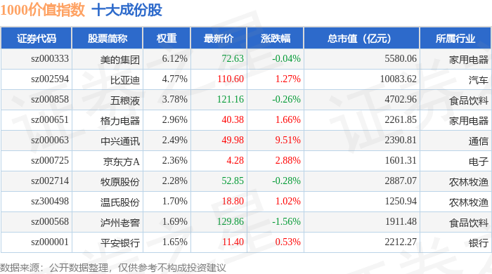 证券之星消息,10月9日,1000价值(399631)指数报收于2278.4点,涨1.43%,成交2246.53亿元,换手率2.03%。当日该指数成份股中,上涨的有243家,浙富控股以10.12%的涨幅领涨,下跌的有85家,巨人网络以5.84%的跌幅领跌。