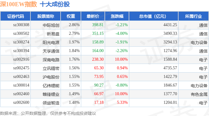 证券之星消息,10月9日,深100EW(399632)指数报收于5438.62点,涨1.65%,成交3710.76亿元,换手率2.24%。当日该指数成份股中,上涨的有70家,赣锋锂业以10.0%的涨幅领涨,下跌的有29家,芒果超媒以6.68%的跌幅领跌。