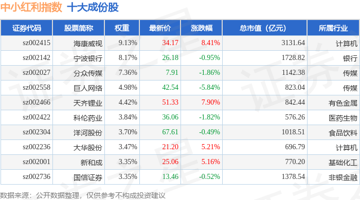 证券之星消息,10月9日,中小红利(399649)指数报收于3275.02点,涨1.61%,成交489.5亿元,换手率1.72%。当日该指数成份股中,上涨的有32家,杭氧股份以10.02%的涨幅领涨,下跌的有18家,巨人网络以5.84%的跌幅领跌。