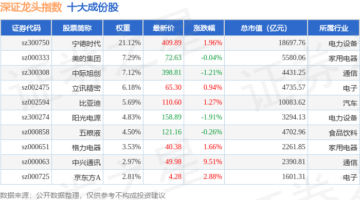 证券之星消息,10月9日,深证龙头(399653)指数报收于3123.42点,涨1.22%,成交1853.83亿元,换手率2.5%。当日该指数成份股中,上涨的有27家,中兴通讯以9.51%的涨幅领涨,下跌的有23家,芒果超媒以6.68%的跌幅领跌。