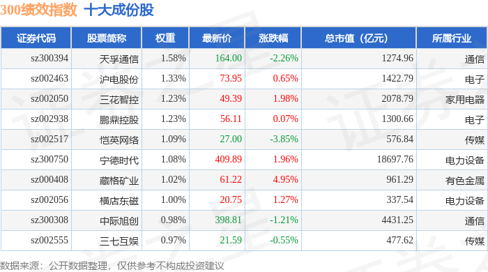 证券之星消息,10月9日,300绩效(399657)指数报收于7251.95点,涨1.64%,成交6529.47亿元,换手率2.54%。当日该指数成份股中,上涨的有212家,迈为股份以17.75%的涨幅领涨,下跌的有85家,光线传媒以10.53%的跌幅领跌。