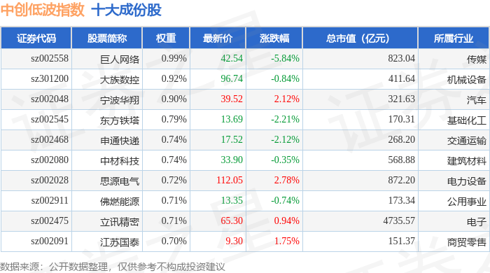 证券之星消息,10月9日,中创低波(399665)指数报收于2341.82点,涨1.39%,成交1992.64亿元,换手率2.12%。当日该指数成份股中,上涨的有141家,国瓷材料以11.56%的涨幅领涨,下跌的有58家,万达电影以7.96%的跌幅领跌。