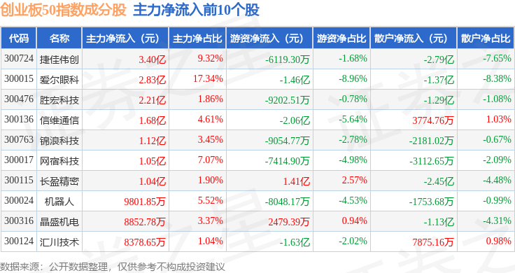 资金流向方面,创业板50(399673)指数成份股当日主力资金净流出合计87.12亿元,游资资金净流入合计33.35亿元,散户资金净流入合计53.77亿元。成份股资金流向详情见下表: