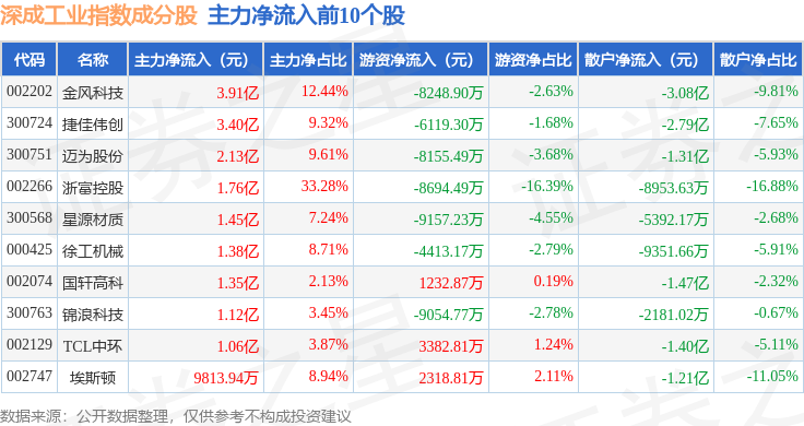 资金流向方面,深成工业(399682)指数成份股当日主力资金净流出合计38.76亿元,游资资金净流入合计15.07亿元,散户资金净流入合计23.69亿元。成份股资金流向详情见下表: