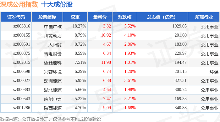 证券之星消息,10月9日,深成公用(399689)指数报收于864.16点,涨3.19%,成交69.88亿元,换手率1.38%。当日该指数成份股中,上涨的有16家,中国广核以5.52%的涨幅领涨。