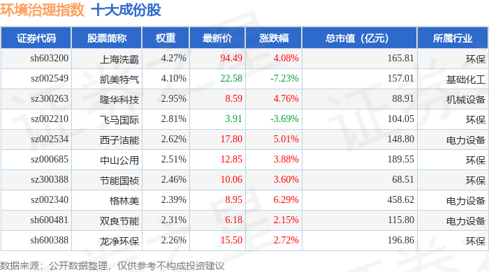 环境治理(399806)指数十大成份股详情如下: