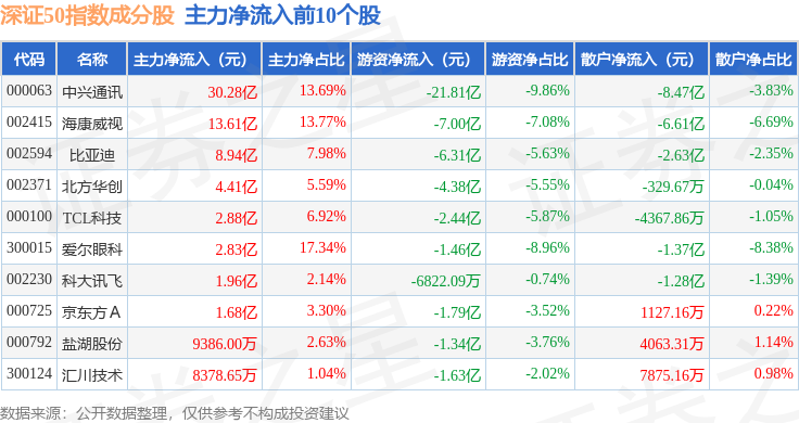 资金流向方面,深证50(399850)指数成份股当日主力资金净流出合计11.09亿元,游资资金净流出合计16.87亿元,散户资金净流入合计27.97亿元。成份股资金流向详情见下表: