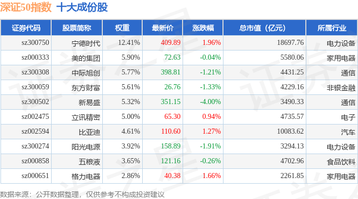 证券之星消息,10月9日,深证50(399850)指数报收于9416.73点,涨1.09%,成交2554.33亿元,换手率2.82%。当日该指数成份股中,上涨的有32家,中兴通讯以9.51%的涨幅领涨,下跌的有18家,新易盛以4.0%的跌幅领跌。