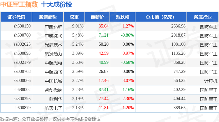 证券之星消息,10月9日,中证军工(399967)指数报收于12743.11点,涨1.29%,成交657.61亿元,换手率2.44%。当日该指数成份股中,上涨的有58家,西部超导以20.0%的涨幅领涨,下跌的有18家,图南股份以3.27%的跌幅领跌。