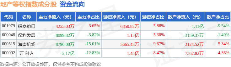 资金流向方面,地产等权(399983)指数成份股当日主力资金净流出合计3.43亿元,游资资金净流入合计3.81亿元,散户资金净流出合计3777.88万元。成份股资金流向详情见下表: