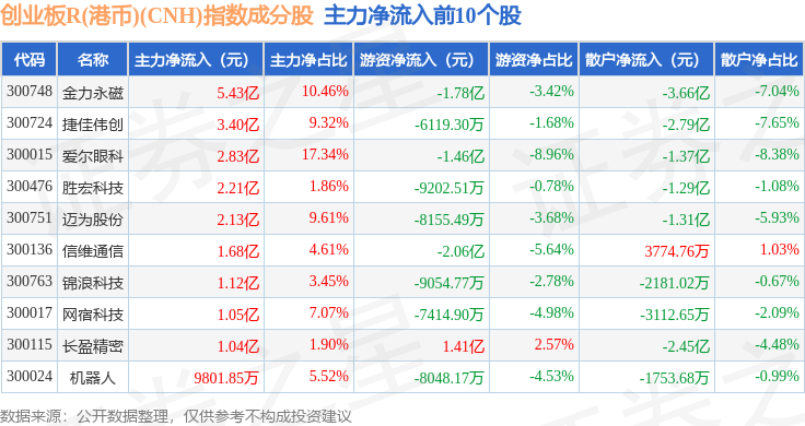 资金流向方面,创业板R(港币)(CNH)(470006)指数成份股当日主力资金净流出合计86.5亿元,游资资金净流入合计32.81亿元,散户资金净流入合计53.7亿元。成份股资金流向详情见下表: