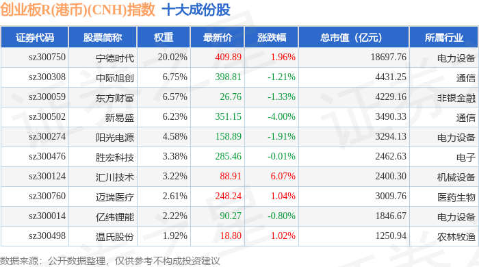 创业板R(港币)(CNH)(470006)指数十大成份股详情如下: