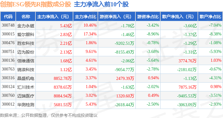 资金流向方面,创指ESG领先R(470031)指数成份股当日主力资金净流出合计38.36亿元,游资资金净流入合计16.63亿元,散户资金净流入合计21.73亿元。成份股资金流向详情见下表: