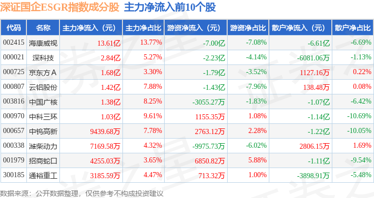 资金流向方面,深证国企ESGR(470055)指数成份股当日主力资金净流入合计10.0亿元,游资资金净流出合计12.25亿元,散户资金净流入合计2.24亿元。成份股资金流向详情见下表:
