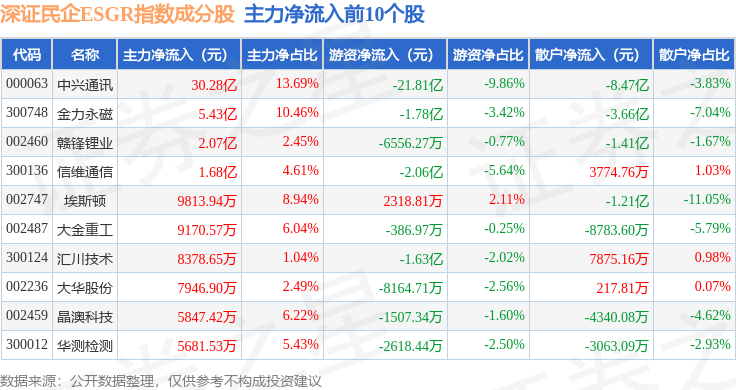 资金流向方面,深证民企ESGR(470056)指数成份股当日主力资金净流出合计12.35亿元,游资资金净流出合计2.25亿元,散户资金净流入合计14.61亿元。成份股资金流向详情见下表: