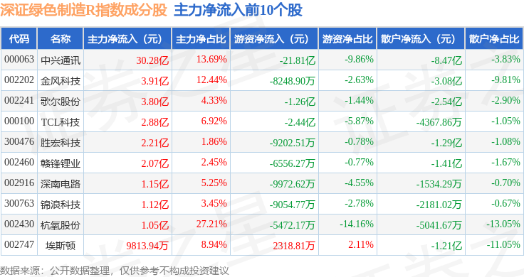 资金流向方面,深证绿色制造R(470069)指数成份股当日主力资金净流入合计6.67亿元,游资资金净流出合计18.45亿元,散户资金净流入合计11.78亿元。成份股资金流向详情见下表: