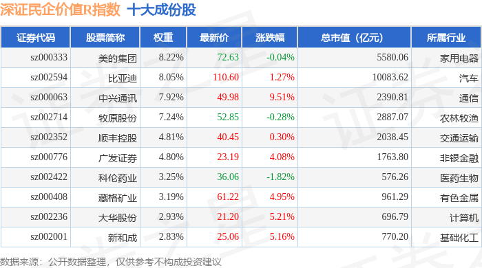 深证民企价值R(470072)指数十大成份股详情如下: