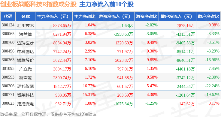 资金流向方面,创业板战略科技R(471004)指数成份股当日主力资金净流出合计9.2亿元,游资资金净流入合计1.33亿元,散户资金净流入合计7.87亿元。成份股资金流向详情见下表: