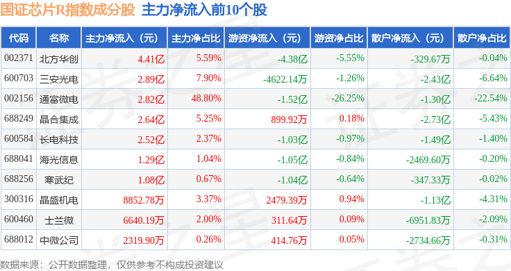资金流向方面,国证芯片R(480017)指数成份股当日主力资金净流出合计26.43亿元,游资资金净流入合计14.92亿元,散户资金净流入合计11.51亿元。成份股资金流向详情见下表: