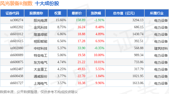 证券之星消息,10月9日,风光装备R(480026)指数报收于1924.64点,涨3.92%,成交590.72亿元,换手率3.43%。当日该指数成份股中,上涨的有28家,东方电气以10.01%的涨幅领涨,下跌的有2家,阳光电源以1.91%的跌幅领跌。